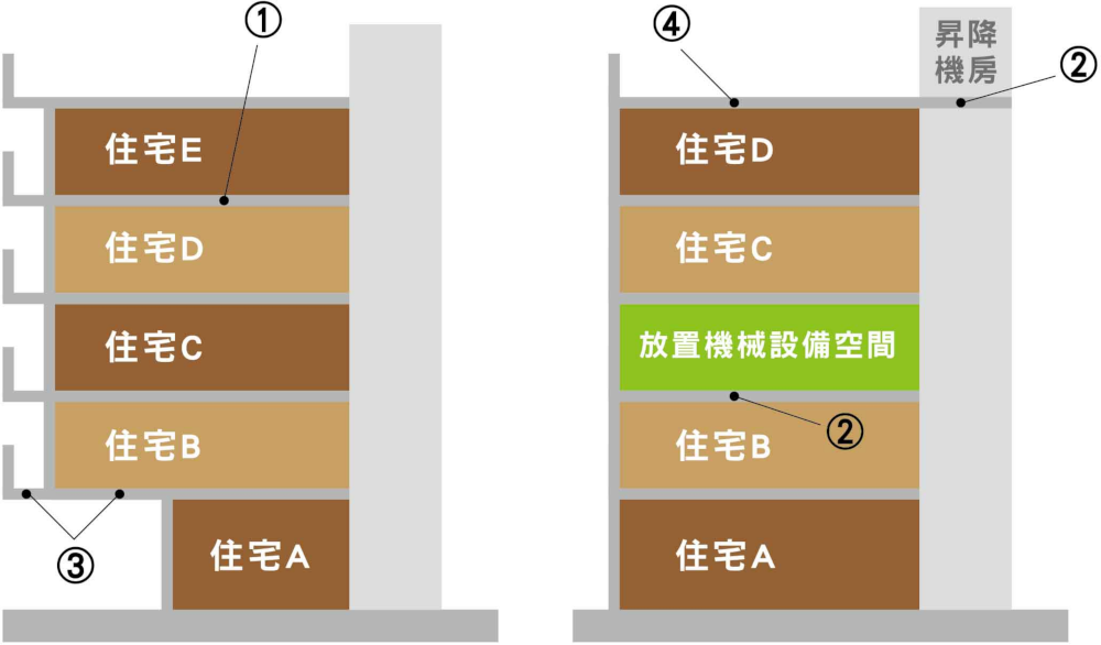 | ② | 建築物昇降機房之樓板,及放置設備空間與下層居室分隔之樓板(Ln,W≦58DB,或於樓板上鋪設表面材△Lw≧25db) |